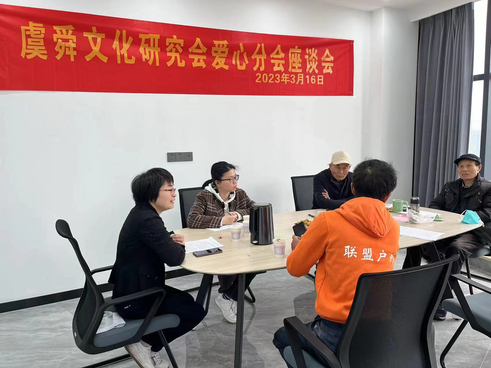 (本报讯,陈彩仙报道)3月16日上午,虞舜文化研究会在会长吴宝炎组织下,在余坤大厦16楼虞舜文化宣讲团办公室召开虞舜文化研究会爱心分会座谈会,会议由副会长陈彩仙主持,先由宣讲团团长郭秋娥发言,她总结了宣讲团二年来配合研究会下乡演出、演讲,用“虞舜传说”讲座和莲花落形式来传承虞舜文化,效果显著,近年来,宣讲团为传承虞舜文化起到了先锋模范作用!然后各爱心分会负责人座谈:联盟爱心社会长王祥荣讲了他们如何去农村、社区等单位搞献爱心活动,刚刚他们与自行车协会,攀浪协会成立了三协之家,结束了长期流浪过日子的局面,三协会有了自己固定的办公住所!心梦爱心社老骨干邵觉先讲了他10多年每天做好事,哪里有困难,哪里有心梦,他讲了自己亲身经历的一件件爱心事,听起来件件都很感人,只要帮到人家了就感觉自己成功了,还有陈溪分会因为刚成立不久,工作还未完全开展,分会代表史皓翼表示,今后会配合总会做好工作的!最后总会会长吴宝炎做总结发言,表扬了各分会的成绩,希望大家年初有计划,年中有活动,年底有总结!